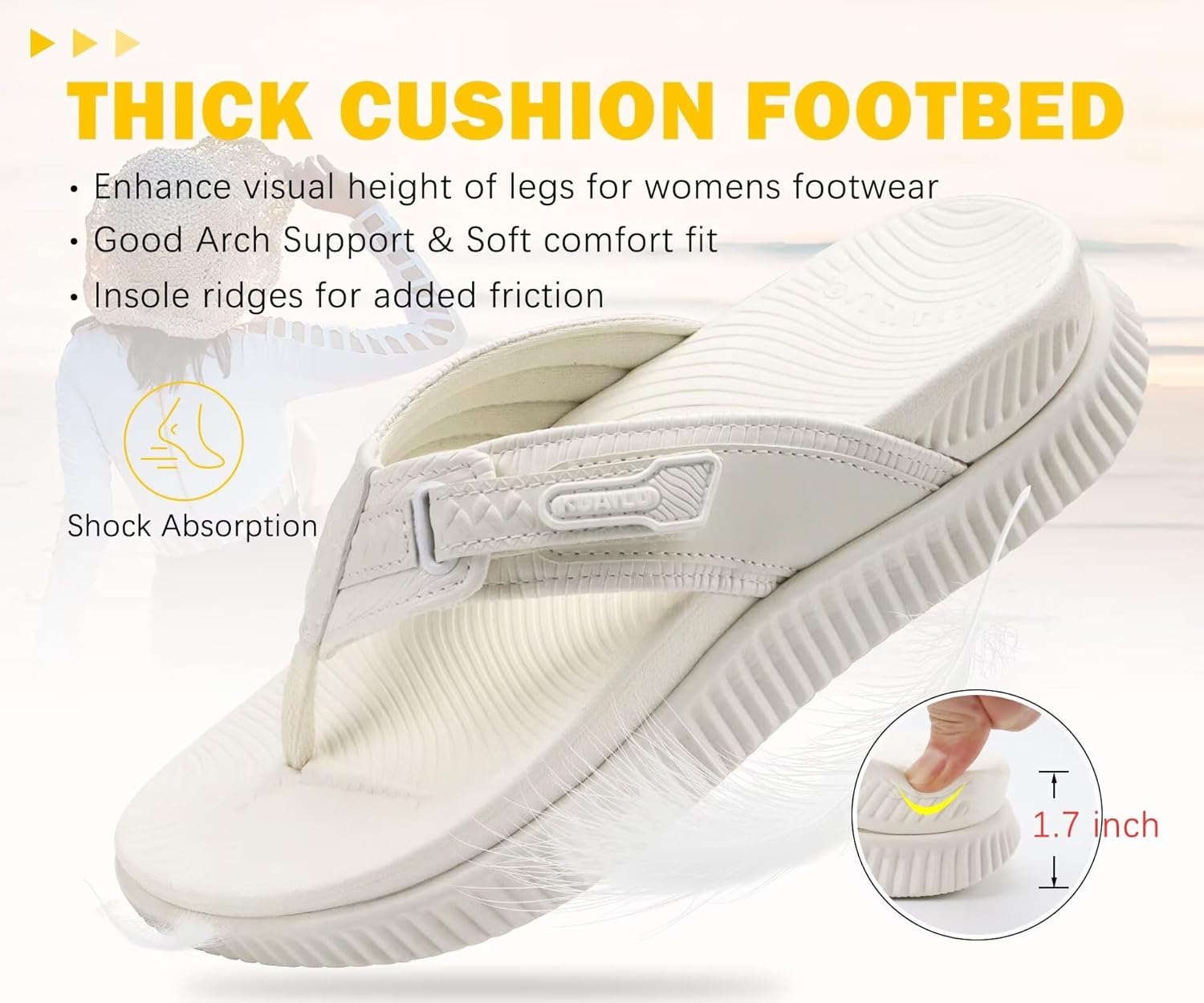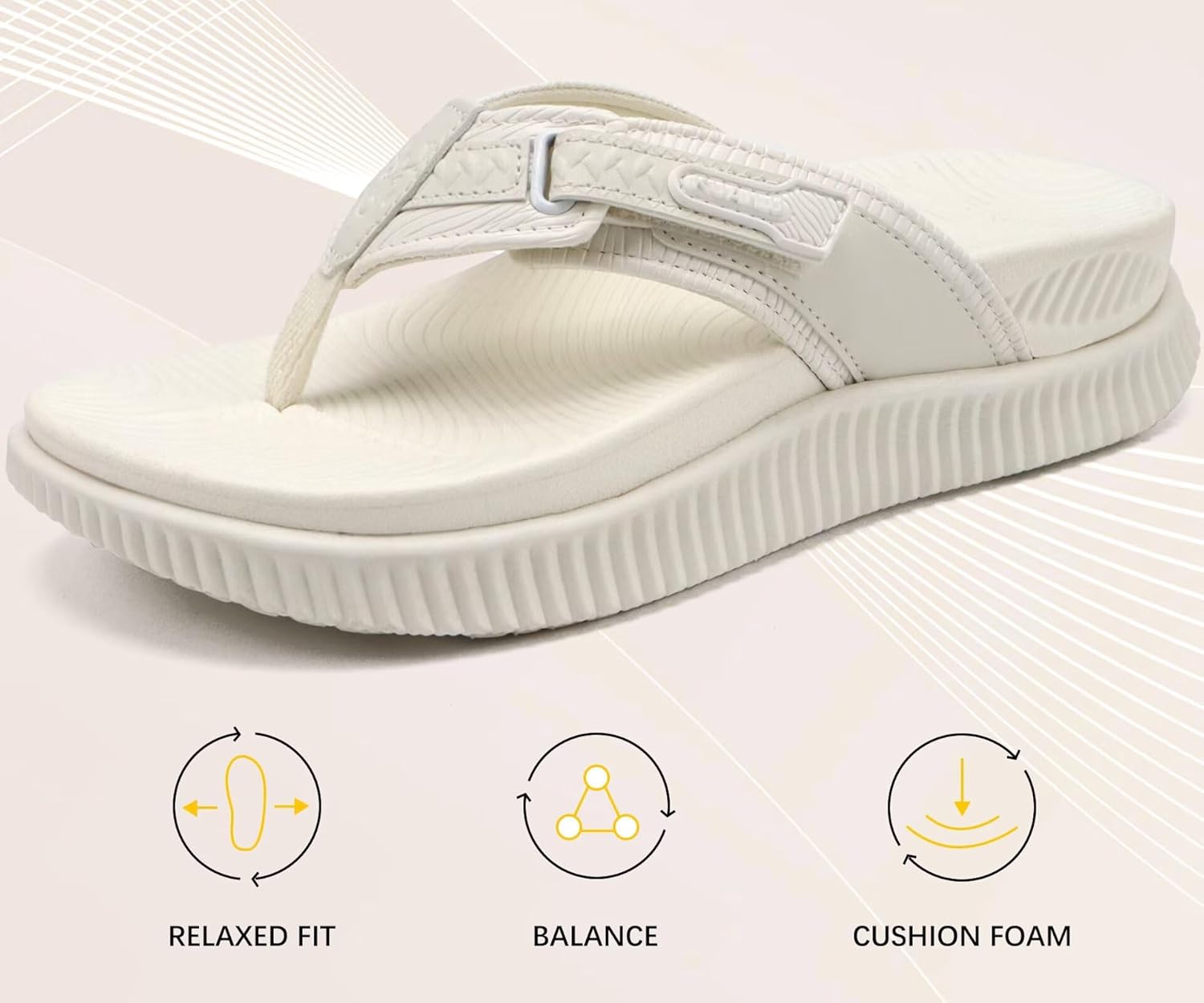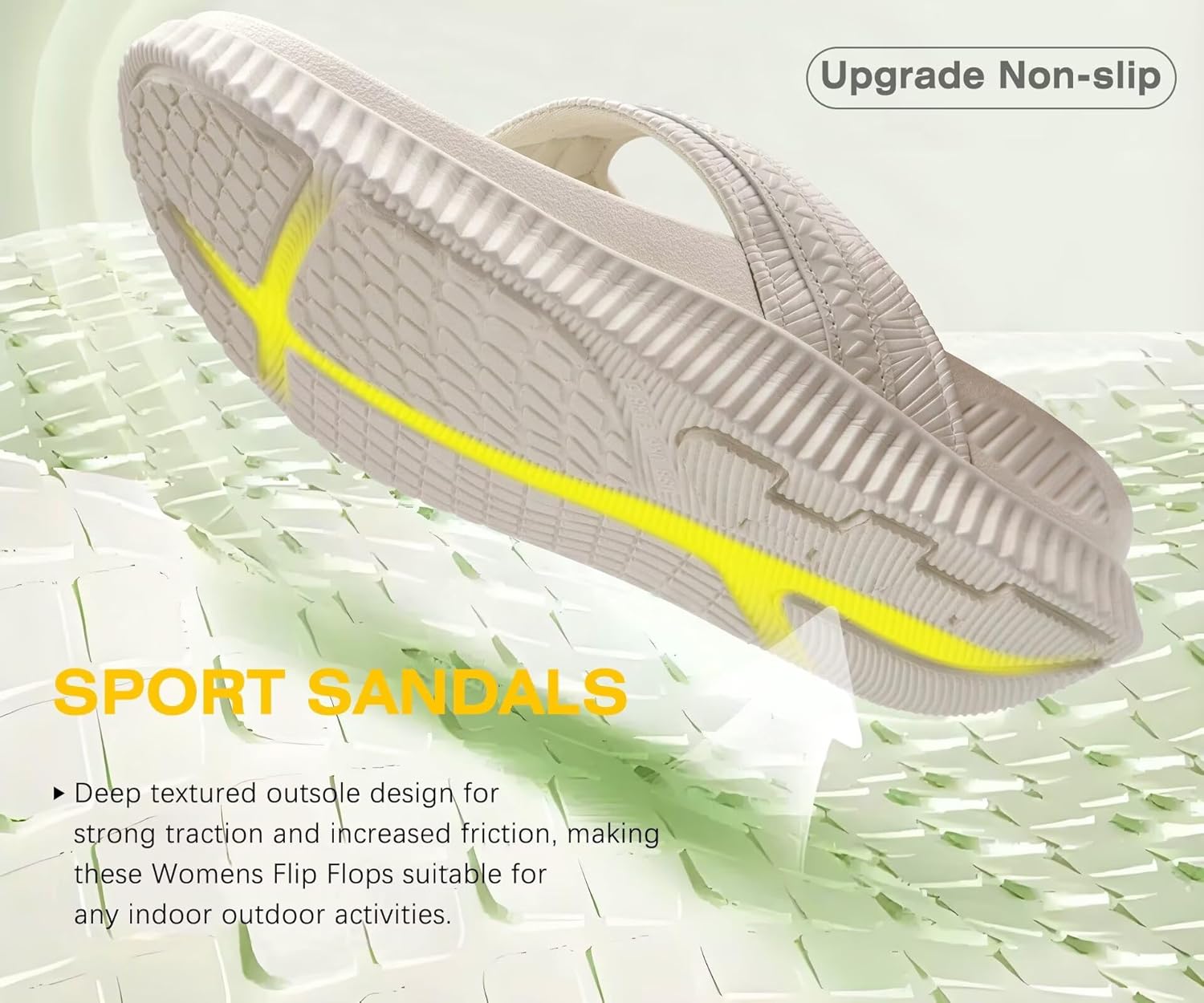 - FASHION WOMENS FLIP FLOPS are sport and casual style. Womens Sandals open toe design keep your feet cool in summer. T-Strap is made of skin-friendly toe post and breathable fabric lining, easy to clean and quick-dry. Premium ortho arches thick cushion serve walking on cloud comfort.