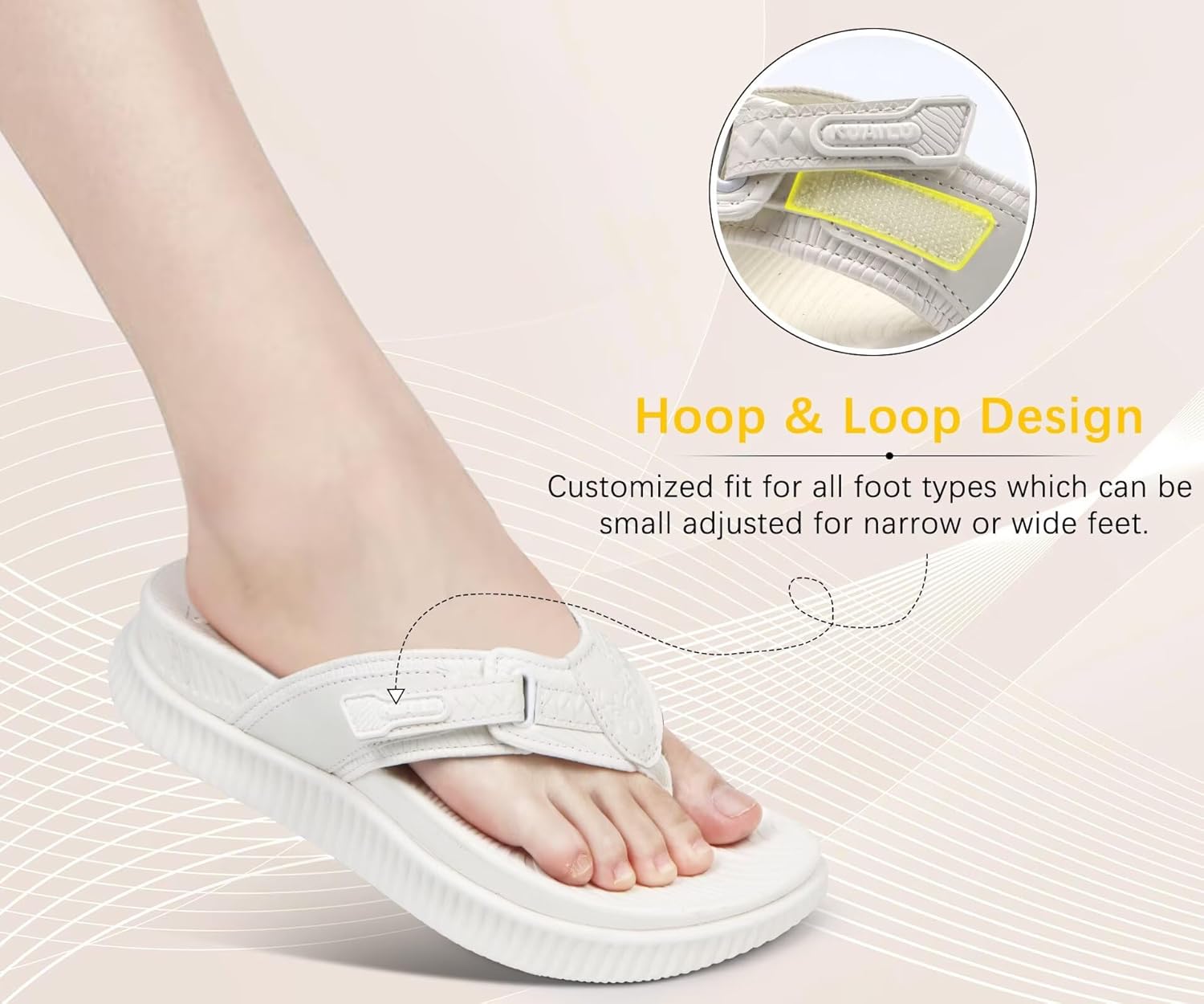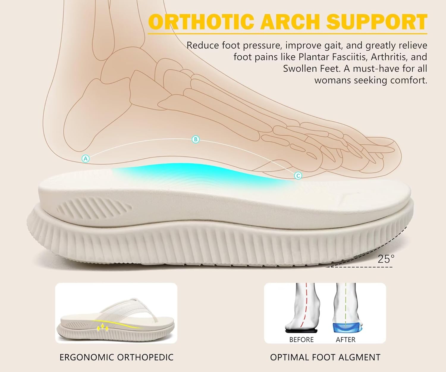 - ORTHOPEDIC FLIP FLOPS FOR WOMEN with 1.2″ protective deep heel cup and 6mm heel-toe drop height to provide improved stability and support. Flip Flops for Women with ergonomic Arch Support can relieve stress on feet and joints and improve gait. Orthotic Flip Flops for Women is a must-have for all woman seeking comfort, ideal for Plantar Fasciitis, Arthritis, and Swollen Feet.