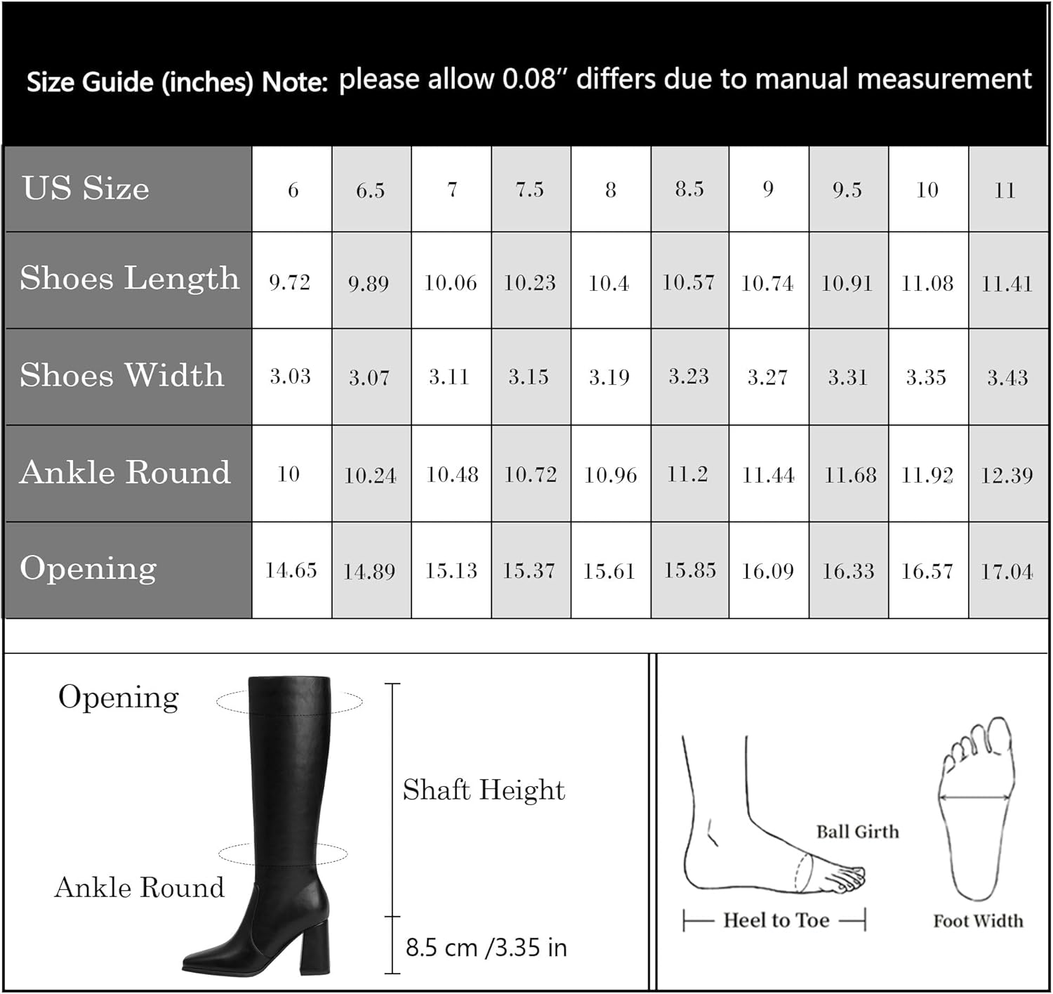 - [Comfortable Chunky Heel Boots]:Womens knee high boots with chunky heel design,and the heel heigt is 8.5cm/3.35 inch, which is a height that increases the height while not losing comfort.