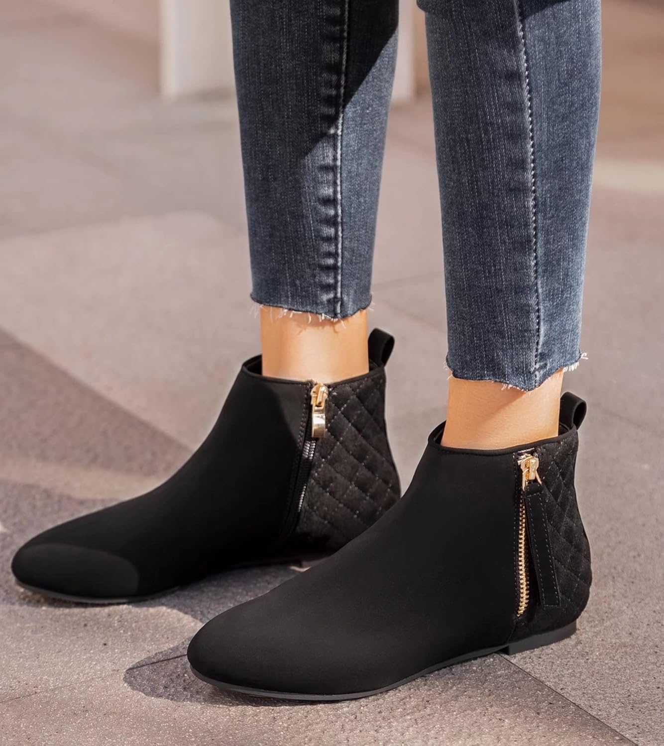 These ankle boots are exactly what I was looking for. They have a soft velvet shell with stylish diamond stitching and a strong, durable zipper. The sizing was perfect and they fit comfortably with a cushioned insole and slip-resistant sole. I especially appreciate the low heels that make walking feel natural and provide good stability.